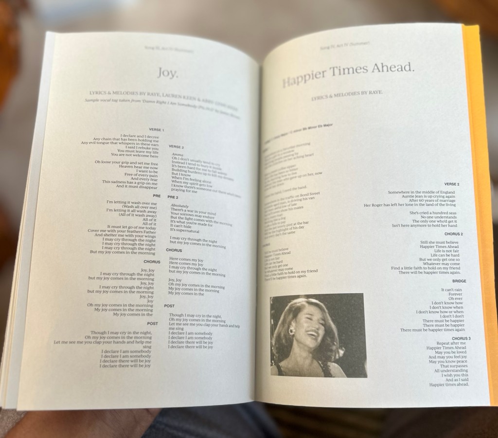 The renowned pop artist known as Raye is known for combining different genres and eras of music for the purposes of storytelling that feel almost cinematic in nature. This was especially prevalent in her last album, My 21st Century Blues, a project that combined pop and R&B to tell the autobiographical story of the artist herself. (Escapism and Worth It are definitely my favorite tracks from that particular album.) Keeping Raye’s knack for storytelling in mind, I wanted to do something a little different for this listening experience. I went to my local record store and got the album on vinyl. I didn’t hear any songs or singles from the album prior, so I was going into it completely blind. Opening the packaging of the vinyl, I was surprised to see a booklet that not only contained the album’s credits and lyrics, but also resembled a playbill given to audience members before a stage play starts. It was from this moment I knew I was in for a ride.